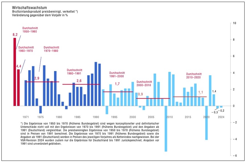 Im Februar 2025 hat das Statistische Bundesamt die Publikation „Volkswirtschaftliche Gesamtrechnungen. Wichtige Zusammenhänge im Überblick 2024“ veröffentlicht. Ich habe Ihnen das im Materialordner eingestellt. Und wenn Sie da rein geschaut haben, dann finden Sie auf der Seite 10 diese Abbildung mit den Zahlen zum langfristigen Wirtschaftswachstum in Deutschland.