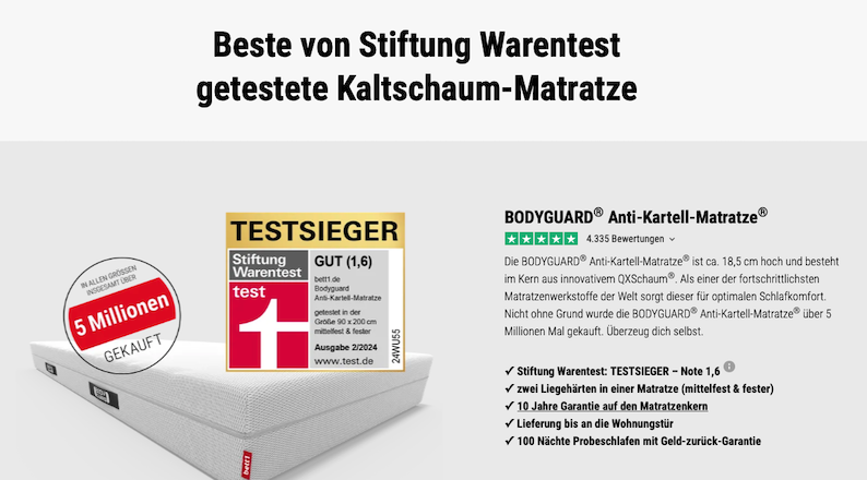 Quelle: Screenshot https://www.bett1.de/produkte/bodyguard-anti-kartell-matratze (Abruf am 06.11.2025)