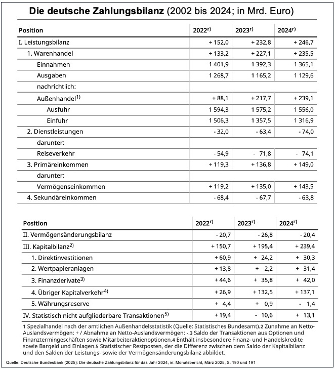 ↩︎ - Die deutsche Zahlungsbilanz wird immer von der Bundesbank veröffentlicht. In deren Monatszeitschrift, den Monatsberichten, gibt es dann einmal im Jahr eine umfangreiche Darstellung der Zahlungsbilanz und deren Entwicklung. Für das vergangene Jahr 2024 vgl. Deutsche Bundesbank (2025): Die deutsche Zahlungsbilanz für das Jahr 2024, in: Monatsbericht, März 2025, S. 168-225. ↩︎