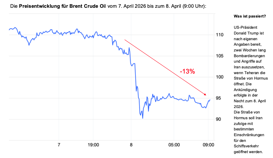 Die „euphorische“ Reaktion auf den Märkten lässt sich auch ein Stück weit erklären, wenn man bedenkt, dass Trump die vollständige Öffnung der Straße von Hormus als eine zentrale Komponente der zweiwöchigen Waffenruhe versprochen hat.