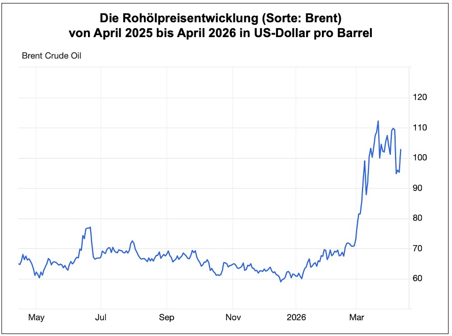 Nun sind wir aber im April 2026 angekommen. Und wie hat sich bis heute der Preis für die europäische Rohöl-Sorte Brent entwickelt?