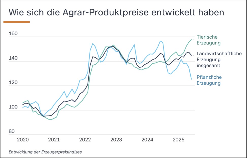 Und einem der im Herbst 2025 veröffentlichten Artikel kann man diese Abbildung zur Entwicklung der Erzeugerpreise (also das, was die Produzenten bekommen) entnehmen: