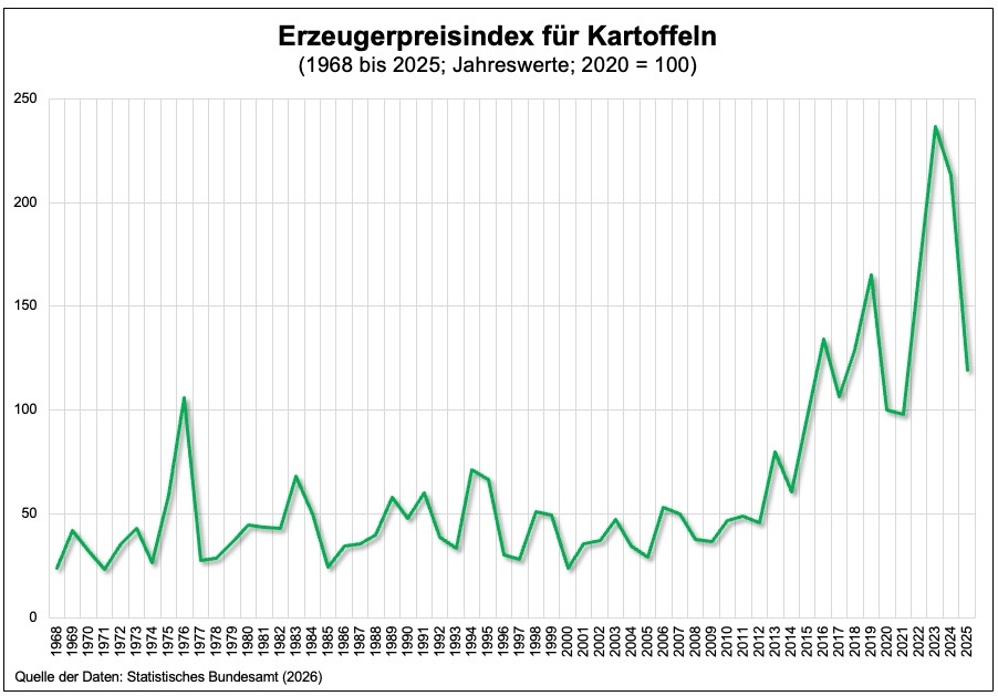 Bereits im November 2025 berichtet Olaf Zinke unter der Überschrift Kartoffelpreise lassen Landwirte verzweifeln – Kartoffeln bleiben auf dem Feld: »Die Kartoffelpreise für Landwirte sind um 60 % gefallen. Im Lebensmitteleinzelhandel kosten Kartoffeln nur 15 Prozent weniger. Für viele Landwirte lohnt es sich bei diesen Preisen nicht, die Kartoffeln vom Feld zu holen. Denn: Die Kosten für Produktion und Ernte übersteigen bei weitem die Erlöse. Sehr viele Kartoffeln gehen deshalb in alternative Verwertungen, wie Biogas oder in den Futtertrog. Besserung ist erstmal nicht in Sicht.«