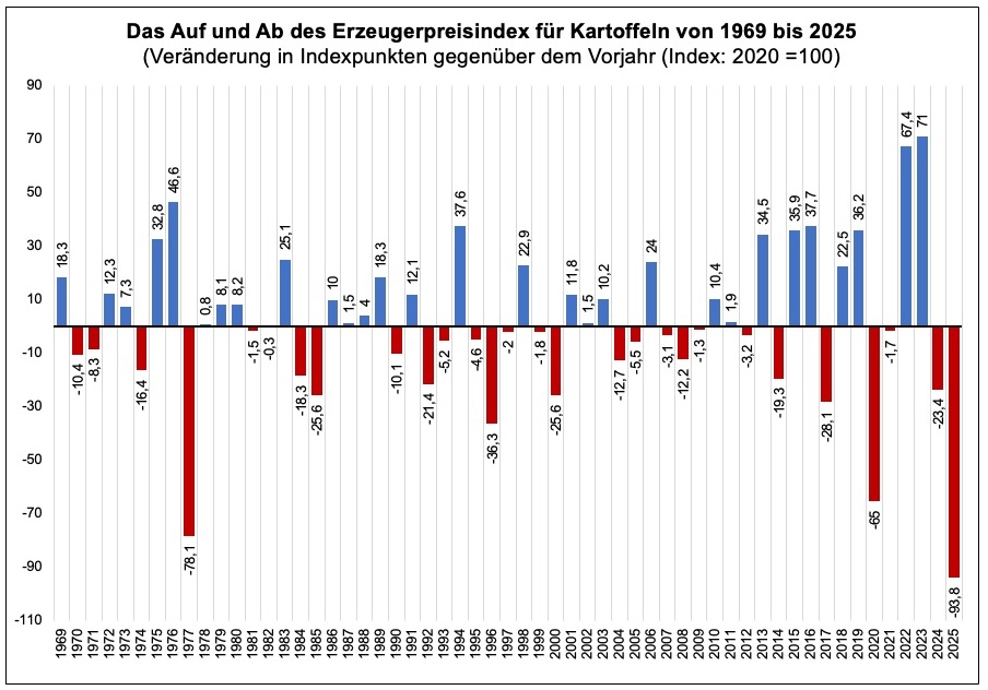Einem der Artikel kann man entnehmen: Es gibt 2025 viel zu viele Kartoffeln. Und das hat den Preis gedrückt. Seit November 2024 ist der Erzeugerpreis, also das, was die Landwirte pro Tonne Kartoffeln bekommen, bis in den Herbst 2025 um rund 42 Prozent gefallen. Zwischen acht und 15 Euro werden pro 100 Kilogramm aufgerufen, so niedrig waren die Preise zuletzt 2021. Weil es in den letzten zwei Jahren zu wenige Kartoffeln gab, war der Preis dementsprechend hoch.